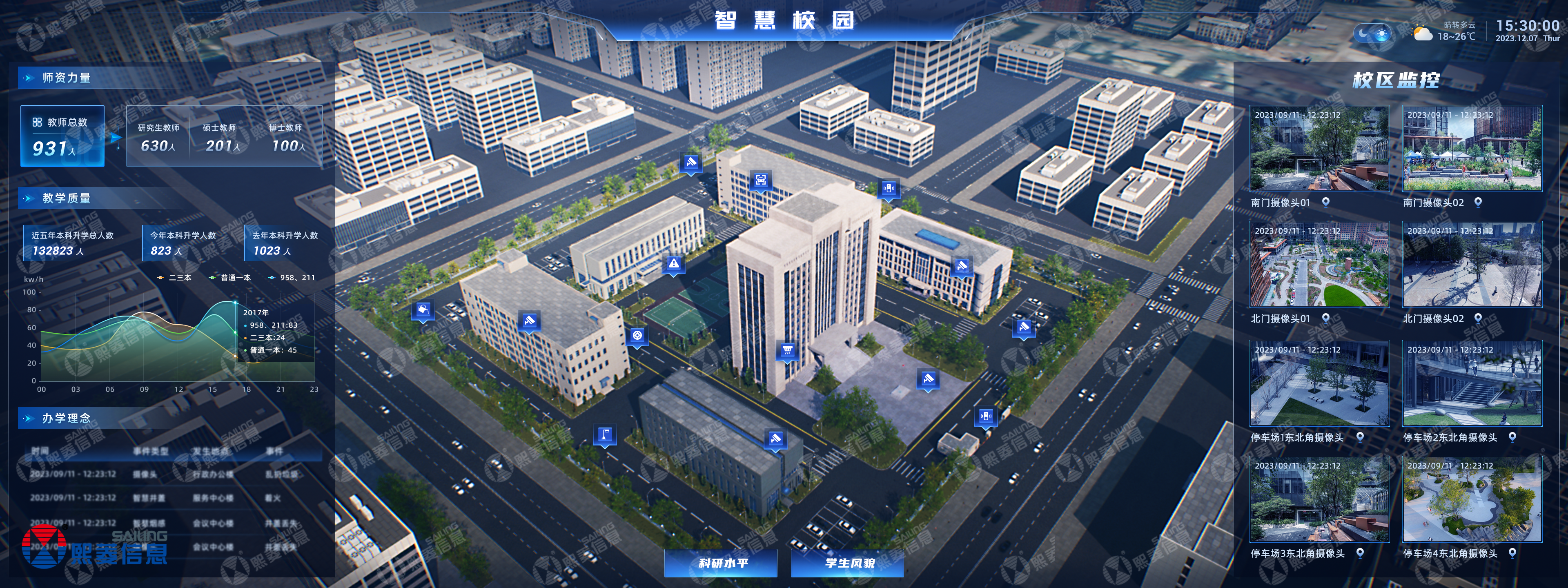 在区域态势方面,将大量校园信息进行简明扼要呈现,一校统览、整体展示;通过师生、院系、专业建设分析,实现教情分析管理的全方位、一体化;推动资产/安防管理数字孪生化,一改以纸质、人员沟通为主的传统模式。